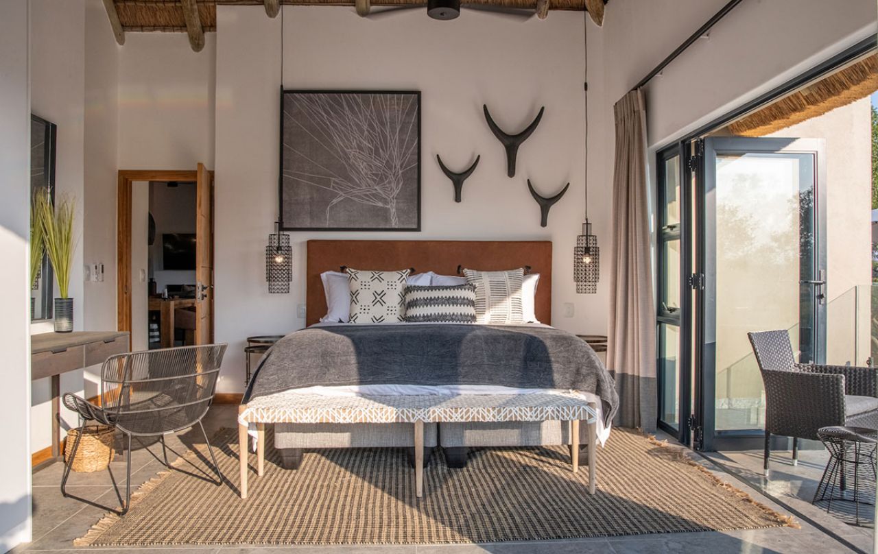 The open plan living area with high volume thatch ceilings adds a distinct ambiance that celebrates nature. The luxurious colour palette encompasses organic textures and materials, which are inspired by the African landscapes. The expansive outdoor living and entertaining space provides breathtaking views overlooking the Sabi River and into the Kruger National Park.