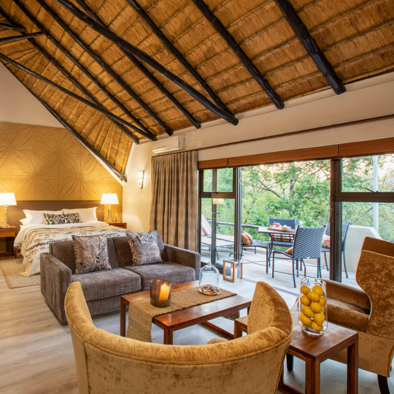 Waterside’s four extra-large Luxury Suites exude an effortless elegance and welcome children of all ages. These one bedroomed suites are 100m² / 1,076ft2 and can be made up as a twin or a king configuration. Jewel-toned oriental rugs cloak the floors, thatch peeks out between ceiling beams, private plunge pools beckon on expansive decks with views over the bush (and sometimes visiting elephants). All of Waterside’s luxurious freestanding suites are linked up to the lodge’s reception, dining areas, library and spa via paths that are illuminated at night. Rooms can be made up as a twin or a king configuration. Children of all ages are welcome in the Luxury Suites should a private vehicle be booked – subject to availability.